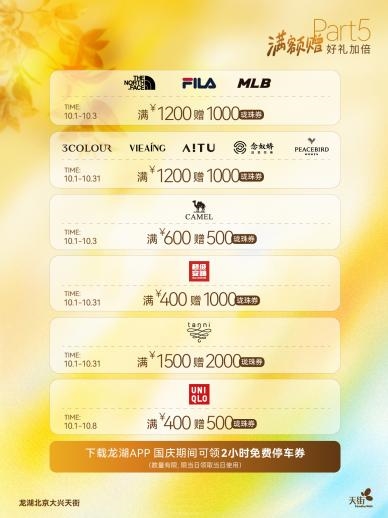 龙湖北京大兴天街:满赠好礼 中秋穿新衣,10月1日-10月3日,北面、FILA、MLB,满1200元赠1000珑珠券,骆驼满600元赠500珑珠券。10.1-10.31,tanni满1500元赠2000珑珠券,AITU、薇迎、三彩、念奴娇、和平鸟女装 满1200元赠1000珑珠券,超级安踏满400元赠1000珑珠券。10.1-10.8,优衣库 满400元赠500珑珠券(以上活动数量有限,领完即止)。
