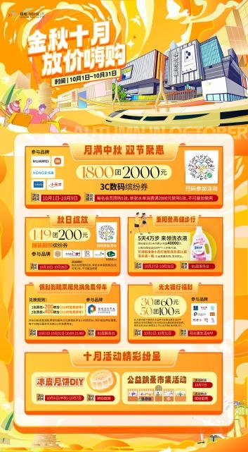 10月1日-10月9日,月满中秋,双节聚“惠”。3C数码品类推出1800团2000元缤纷券(限购1张,每张消费满2000元可运用,不叠加)。10月18日-10月26日,服装服饰品类推出149团200缤纷券(限购1张,每张消费满200可运用,不叠加)。10月6日-10月7日,顾客可至缤纷庭苑DIY冰皮月饼,体会中秋习俗趣味。10月7日当天,更有公益跳蚤阛阓热烈举办,等待您的到来。